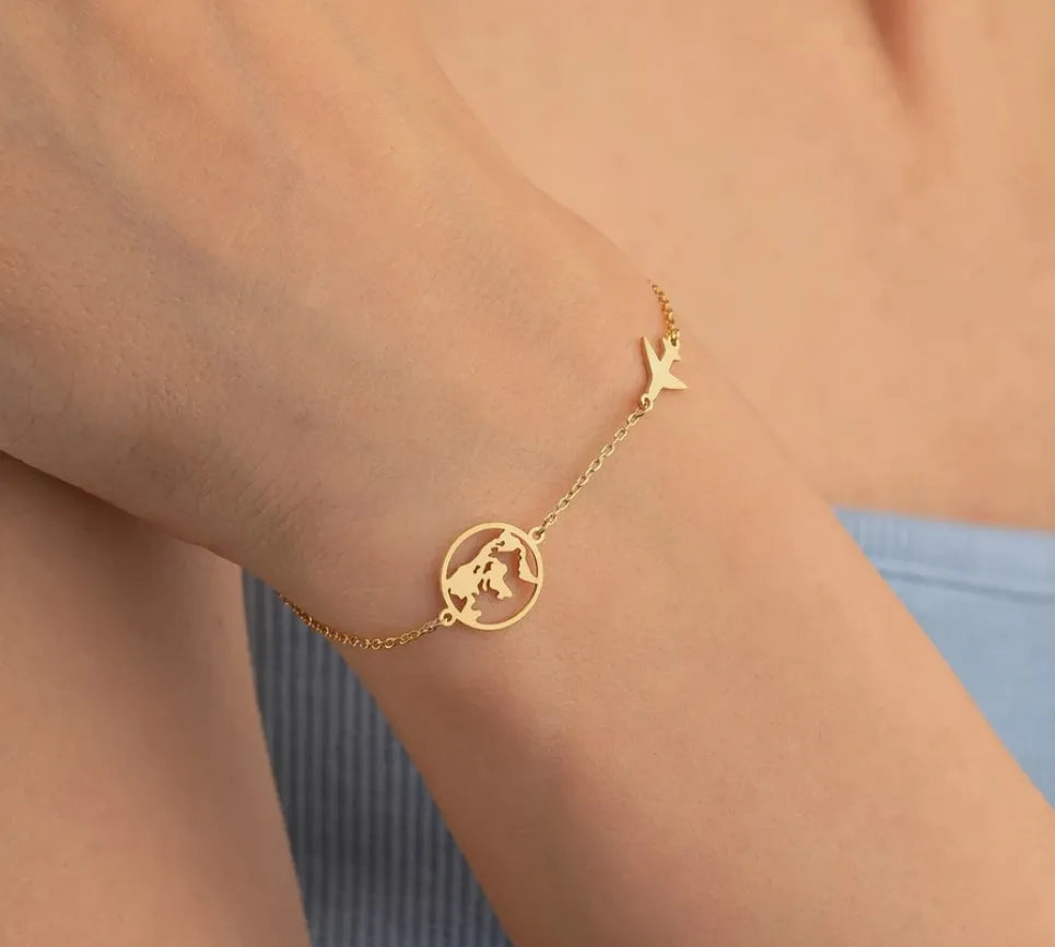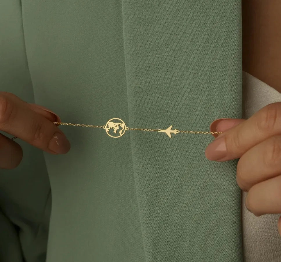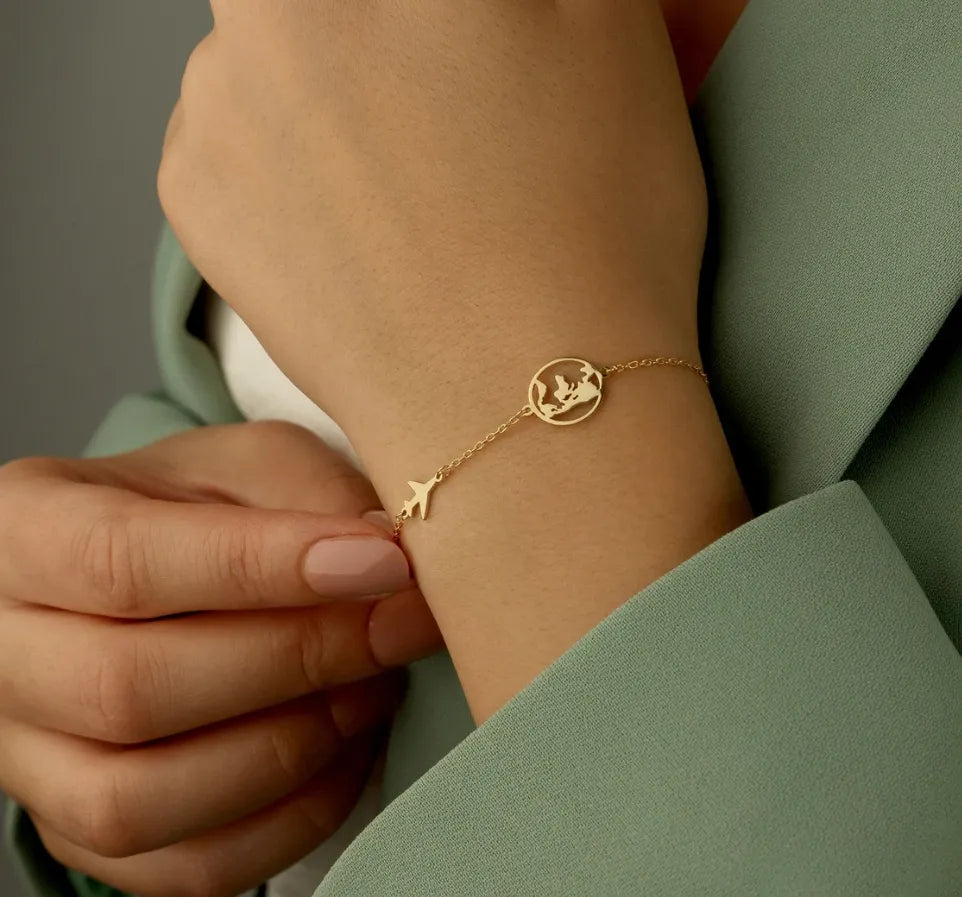 Unser "Global Wings" Armband bringt das Gefühl des Fliegens und der weltweiten Erkundung direkt an dein Handgelenk. Ein filigraner Welt-Anhänger trifft auf ein elegantes Flugzeug aus hochwertigem 925er Silber, die zusammen eine harmonische Verbindung von Eleganz und Abenteuerlust schaffen. Dieses Design erzählt Geschichten von Reisen, Entdeckungen und der Sehnsucht, neue Höhen zu erreichen. Für Fliegerinnen, Weltenbummlerinnen und Träumerinnen, die den Himmel erobern und die Welt aus der Luft sehen möchten.