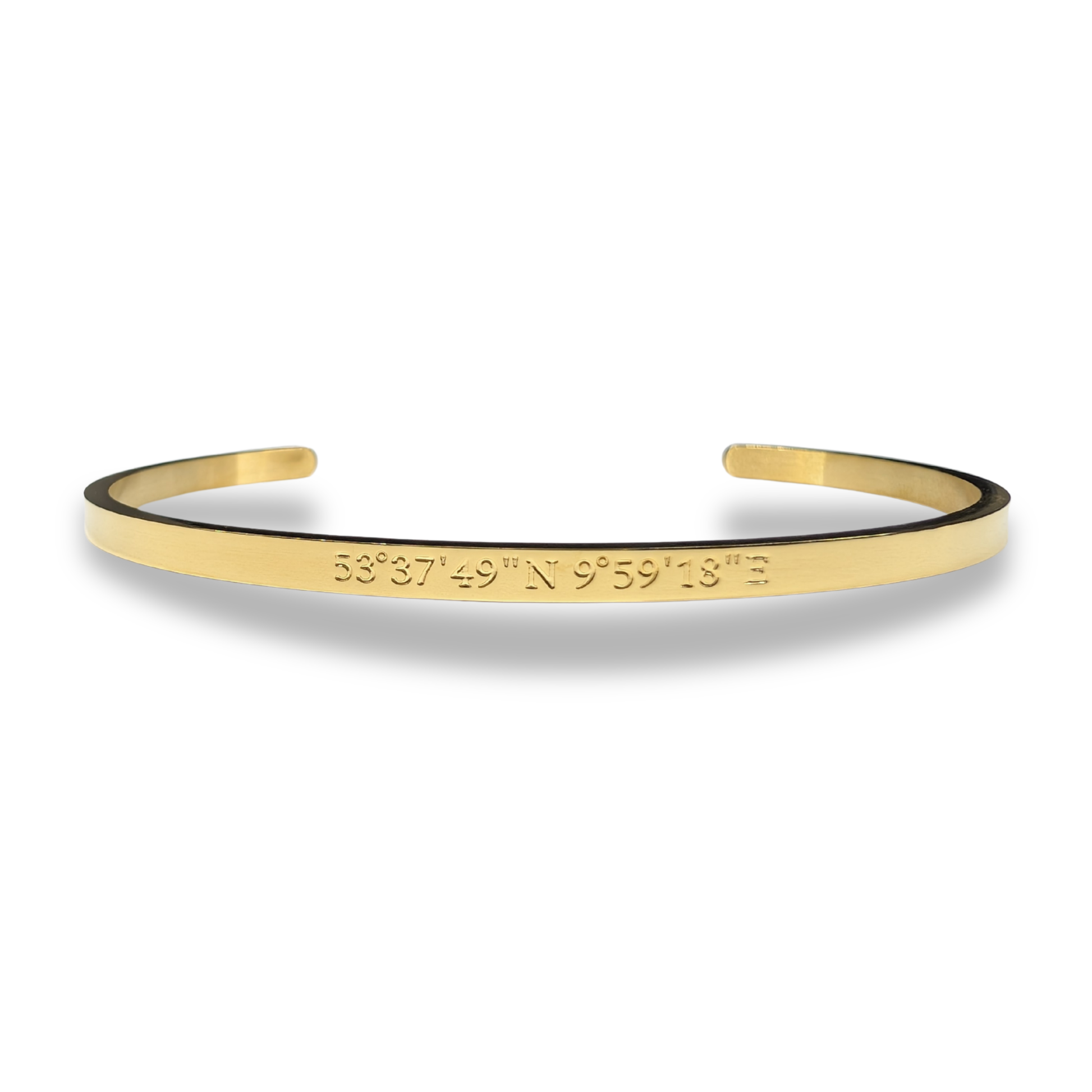 Der Homebase Armreif Hamburg steht für das Gefühl von Ankommen zwischen Elbe, Hafenluft und der unverwechselbaren HAM-Crew. Der elegante Edelstahl-Armreif in Gold oder Silber trägt die eingravierten Koordinaten des Hamburger Flughafens (HAM) – deine persönliche Verbindung zur Base, egal wohin dich die nächsten Flüge bringen.