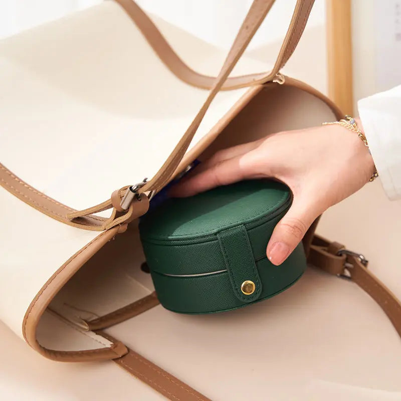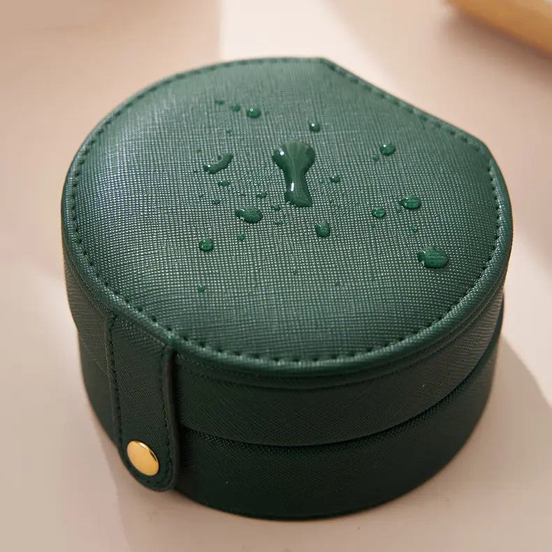 Schütze deinen Schmuck auf Reisen stilvoll mit diesem praktischen, runden Schmuckkästchen aus hochwertigem veganem Saffiano-Leder. Das elegante Design vereint Funktionalität und edlen Look – der perfekte Begleiter für deine Reisen.